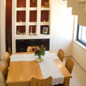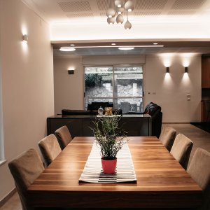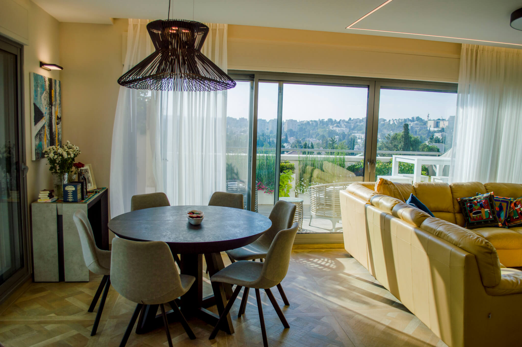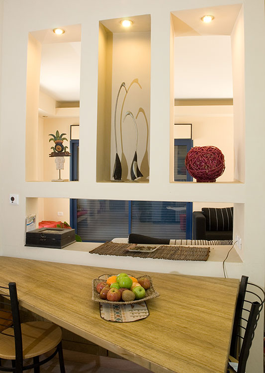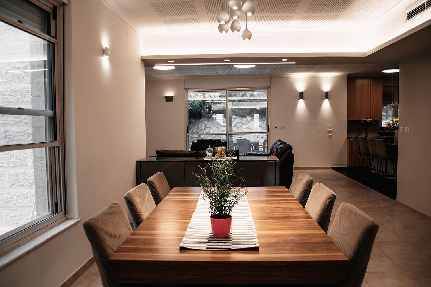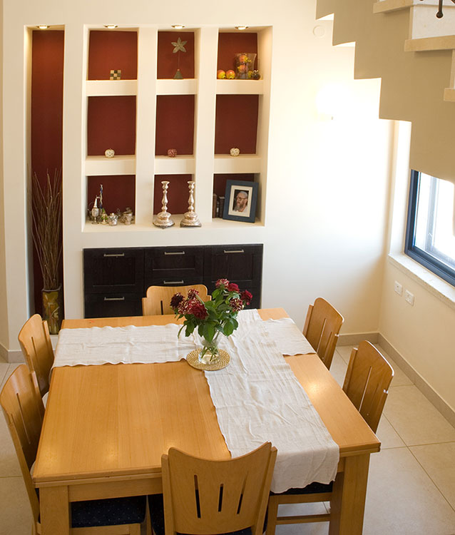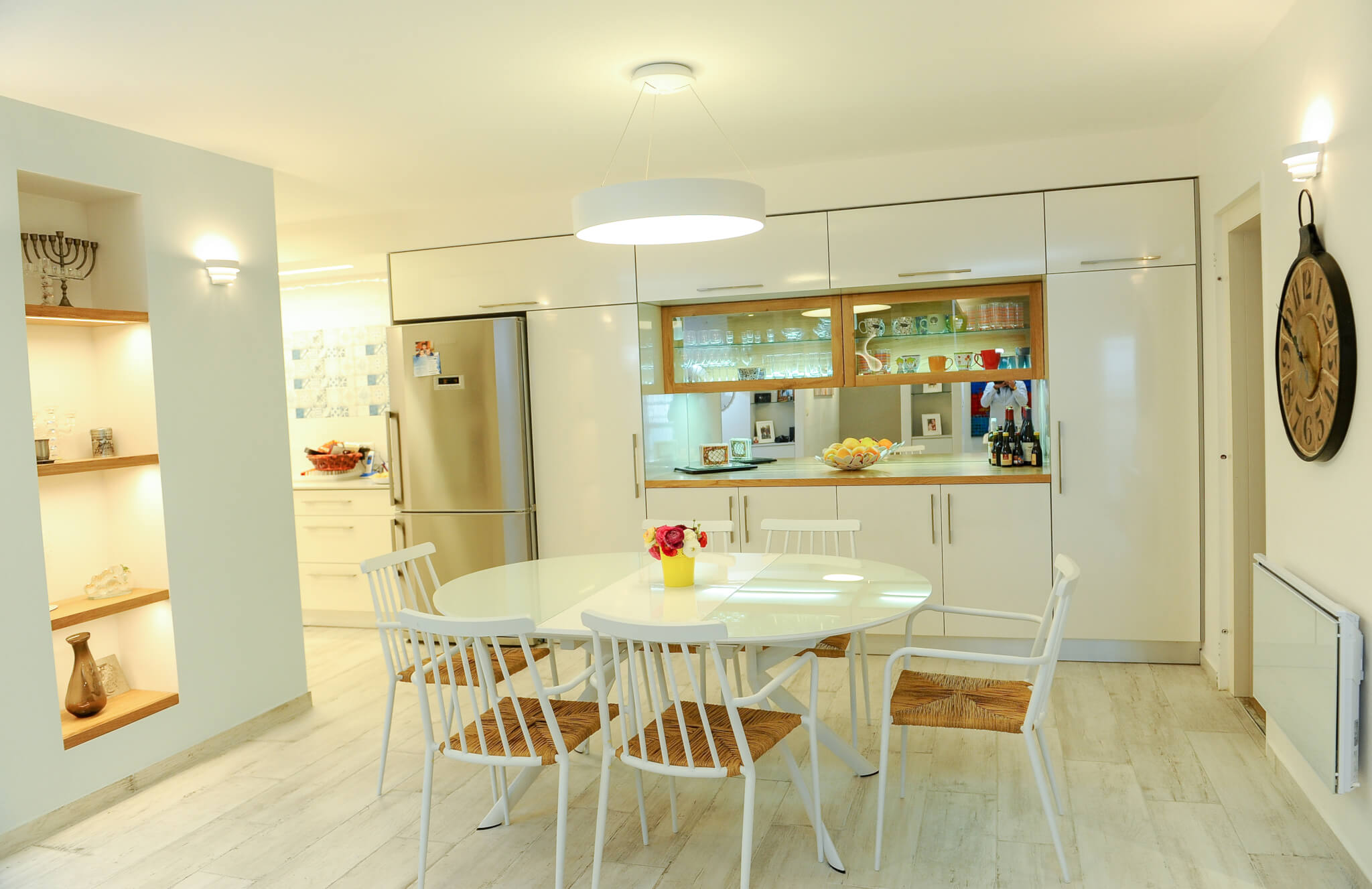 חללים אלה מושקעים מאד כמקום מיפגש משפחתי וחברתי. צריך למצוא איזון בין גודל השטח הנתון לגודל שולחן רצוי לארוח. ספרים, יודאיקה ואביזרי נוי משתלבים במרחב כארונות, מדפים ולעיתים גם בשלוב גבס. מיזוג החלל הגדול משתלב עם תכנון תאורה מקיף